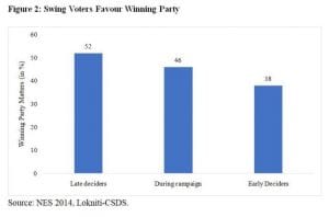 In India, late deciders vote overwhelmingly for the party perceived to be winning. In the National Election Survey (NES) 2014, voters were asked whether they voted for a party because they thought it was going to win, or if winnability was not part of their decision matrix. The data presented in Figure 2 clearly shows that more than half of the late deciders favour the party perceived to be winning. In 2014, the BJP led the Congress by eight percentage points among voters who had made their decision even before the campaign started, but it almost doubled its lead (i.e. 16 percentage points) among those who decided in the last 48 hours.