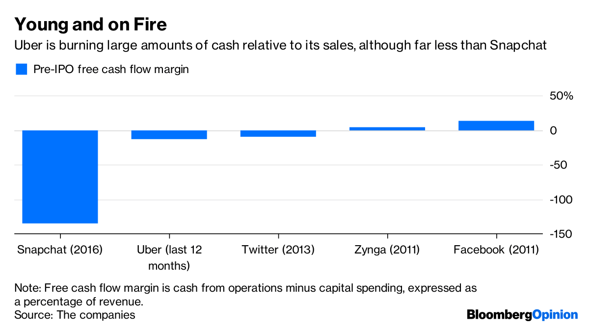 Uber’s cash has let it become this ambitious, but it’s never been forced to live in a world where it has to operate solely with the cash it generates. The company’s free cash flow — or cash generated by its operations minus costs for capital projects — was negative $1.3 billion in the last 12 months, according to Bloomberg News and other media reports on the company’s self-reported, cherry-picked financial figures. For the sake of comparison to a recent but dramatically different era in technology, Facebook had positive free cash flow for three full years when it filed to go public in 2012.