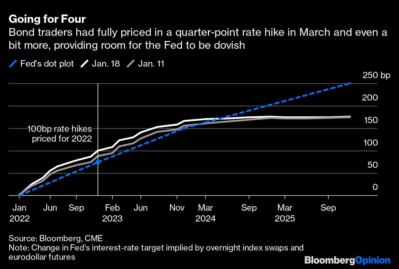 If anything, these splashy hawkish calls are a boon to the Fed because they give Powell and his colleagues more room to be dovish by comparison. The policy statement this week might say something like raising the fed funds rate “may soon be warranted,” setting up a quarter-point move in March. That’s a far cry from the type of panic that Ackman and Hartnett suggest — and yet, just a month ago, only Fed Governor Christopher Waller was explicitly pointing to a likely March liftoff.