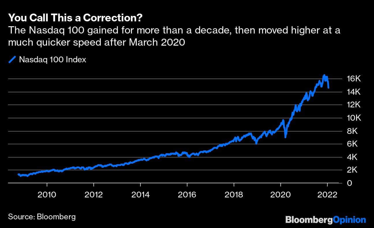 Whether this latest drop counts as “significant” depends on whom you ask. I tend to agree with my Bloomberg Opinion colleague John Authers, who scoffed at saying the Nasdaq 100 is in the midst of a “correction” just because it fell more than 10% from its peak. This latest turbulence came after a ferocious nearly nonstop rally.