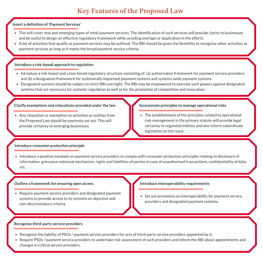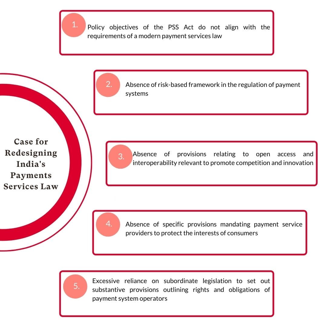 The law was primarily enacted to regulate payment systems from a systemic perspective and to confer the RBI with necessary powers to regulate these systems. Therefore, the PSS Act does not take into account policy goals and legal provisions that are critical to support the growth of a retail payments sector. While the RBI has sought to address the existing gaps in the primary law through directions issued from time to time, this may not be the optimal regulatory/policy response. Such an approach is also not in line with the international best practices where several countries have, along with policy interventions, undertaken efforts to modernise their payments law to adapt to the rapidly evolving industry.