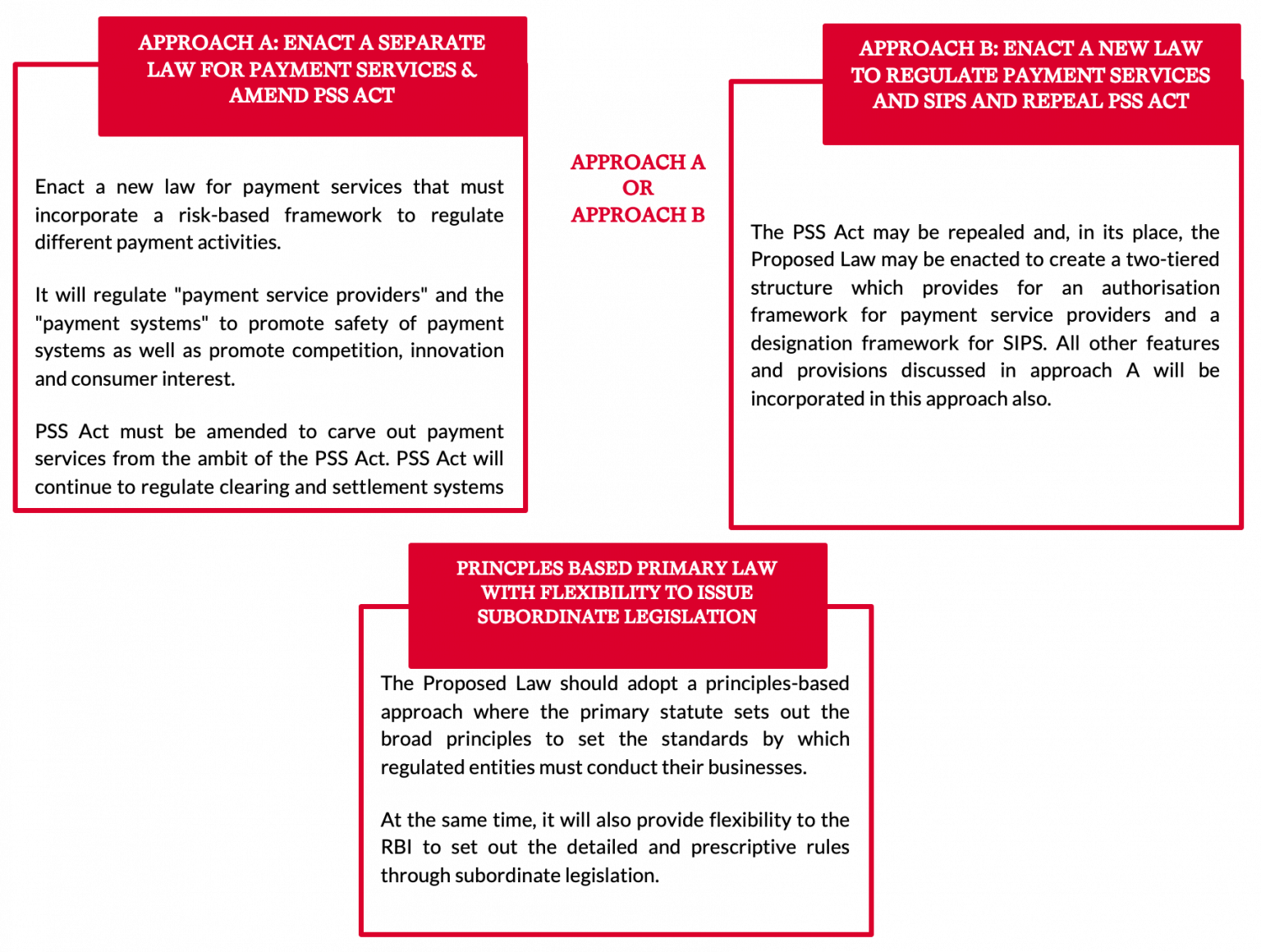 The regulatory framework for digital payments under the PSS Act must be re-designed, to allow it to adapt to new payment products and services and to account for the evolving nature of the payments sector. The approaches and recommendations suggested in this Report for redesigning India’s payment services law is guided by three three primary policy objectives that underpin most modern payments law – (1) ensuring safety and soundness of payment systems, (2) promoting efficiency in the functioning of payment systems; and (3) the protection of consumer interests. To achieve an appropriate balance between these objectives, the Report relies on the following principles – (a) level of regulatory oversight should be commensurate to the risk posed by a payment activity; (b) provide legal certainty to businesses and consumers by setting out the broad contours and mandate under the principal law; and (c) provide flexibility to RBI to design subordinate regulations taking into account the evolving payments landscape. Possible approaches for designing the proposed law are set out below.