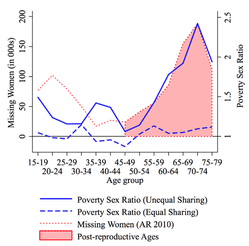 When the unequal allocation of resources within the household is taken into account and the model predictions are used for calculations, the age profile of excess female poverty matches the age distribution of missing women quite well. This match is nearly exact at post-reproductive ages, when the correlation coefficient between excess female mortality and excess female poverty equals 0.96. A simple back-of-the-envelope calculation suggests that up to 73% of missing women at post-reproductive ages can be attributed to the decrease in women’s bargaining power over the lifecycle, and to the consequent increase in female poverty at older ages relative to that of males.