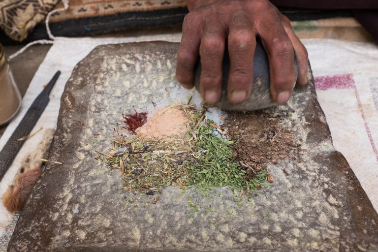 If you were to learn this practice at an educational institution, it would take you five years. However, I learned the Bhoti language script from my father and grandfather. Then I studied Gyud-Zi, the foundational four-part textbook of Sowa Rigpa, and Ashtanga Hridaya, the ancient root texts of Ayurveda. I took the oral and written examinations, and consulted patients under the supervision of the Amchi from the neighboring village. It has been a life-long learning since my childhood, and after I cleared that stage, I was able to pursue advanced studies.