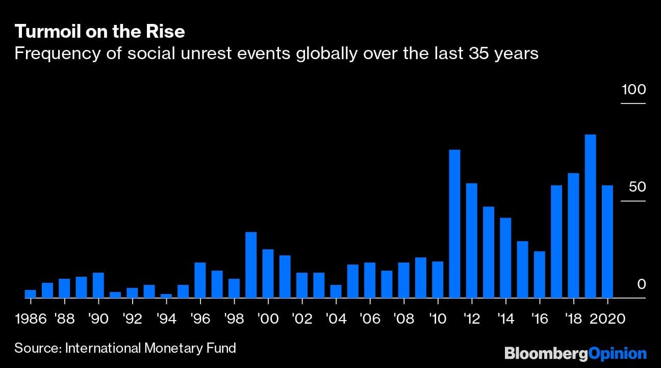 A new paper published by three economists at the International Monetary Fund identifies a rising frequency of social unrest events since the mid-1980s, with peaks in 1999, 2011 and 2019. As Metodij Hadzi-Vaskov, Samuel Pienknagura and Luca Ricci point out, there is a kind of feedback loop, whereby a major unrest event is associated with a 1-percentage-point reduction in GDP six quarters after the event. They cite the yellow-vest protests in France in 2018 and the pro-democracy protests in Hong Kong a year later as examples of the process whereby unruly protests make a country’s economic situation significantly worse.