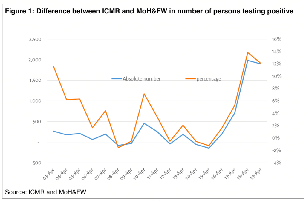 Also, the ICMR’s data did not exactly match with the Ministry of Health and Family Welfare’s, which also used to release data on the number of Covid-positive persons. After the ICMR stopped releasing such data, the health ministry website says its “figures are being reconciled with ICMR”. As Figure 1 shows, the differences were not particularly glaring and the health ministry was not consistently under-reporting numbers, despite occasional spikes.