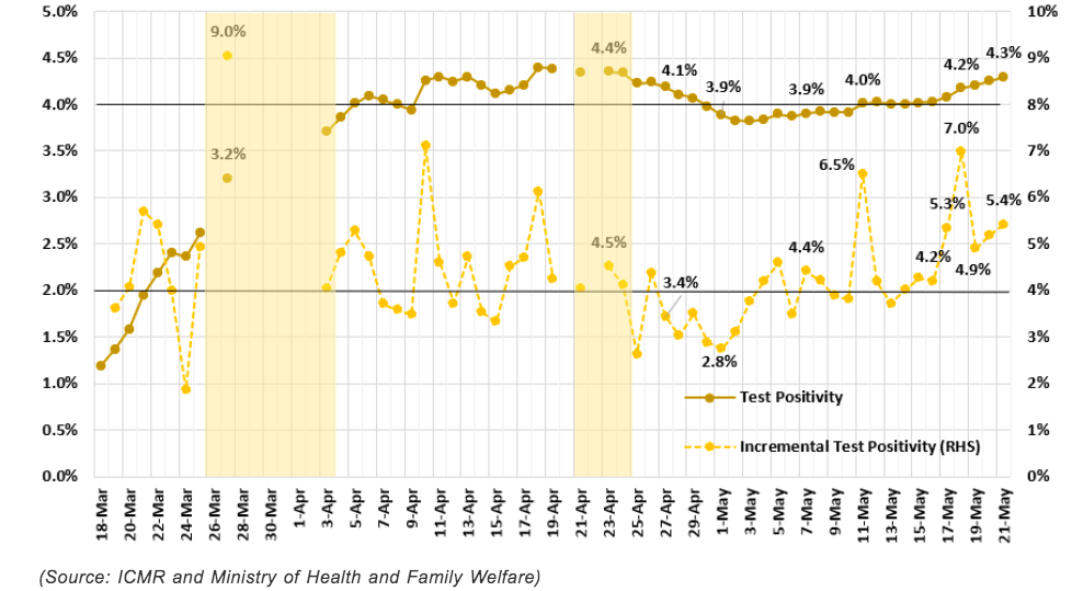 Figure 2: Test Positivity for Covid-19 in India over time (this chart is as of 21 May)