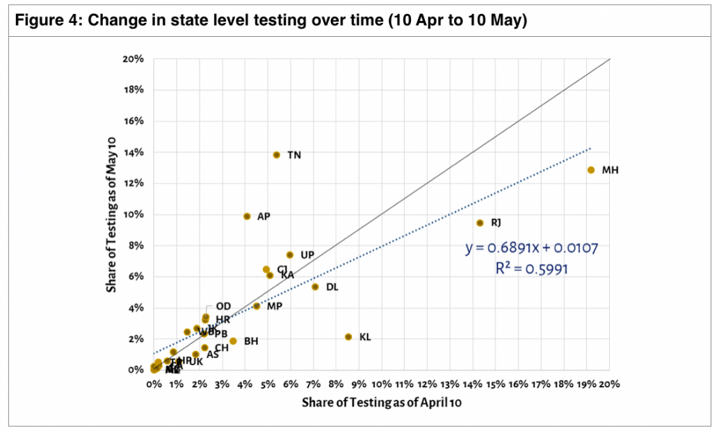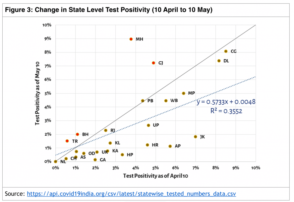 Figure 3 shows that this data indicates the constancy in the national test positivity masks significant churn within the states. There is variation across states and over time. As testing increased between 10 April and 10 May, the test positivity of most states changed – most declined, with the exception of Maharashtra and Gujarat.