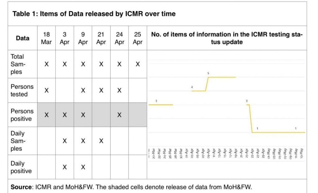 Ideally, the test positivity would be the number of persons testing positive divided by the number of persons tested, but this data is no longer released by official sources. Between 9 and 19 April, the ICMR released the most information — number of total samples tested, the number of total people tested, the number of persons found positive — but it all stopped on 25 April, and Covid-19 numbers kept increasing in India. The ICMR has since only released the cumulative total samples tested. Table 1 shows the extent of information released by ICMR at different times in the past two months.