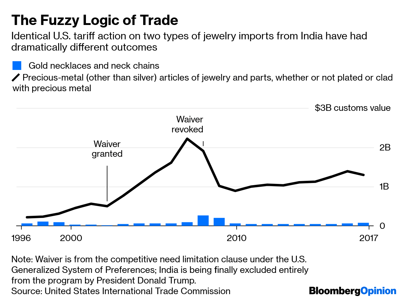 The latest action, however, isn’t about improving workers’ conditions or enforcing property rights. In expelling India, the largest GSP beneficiary, the Trump administration is making a declaration: While its trade relationship with New Delhi may not be as frayed as it is with Beijing, it’s certainly fraught. The last straw, as my colleague Mihir Sharma wrote, may well have been India’s aggressive moves against U.S. tech giants, which restricted online sellers such as Amazon.com Inc. and gave Indian tycoon Mukesh Ambani’s e-commerce ambitions a leg up.