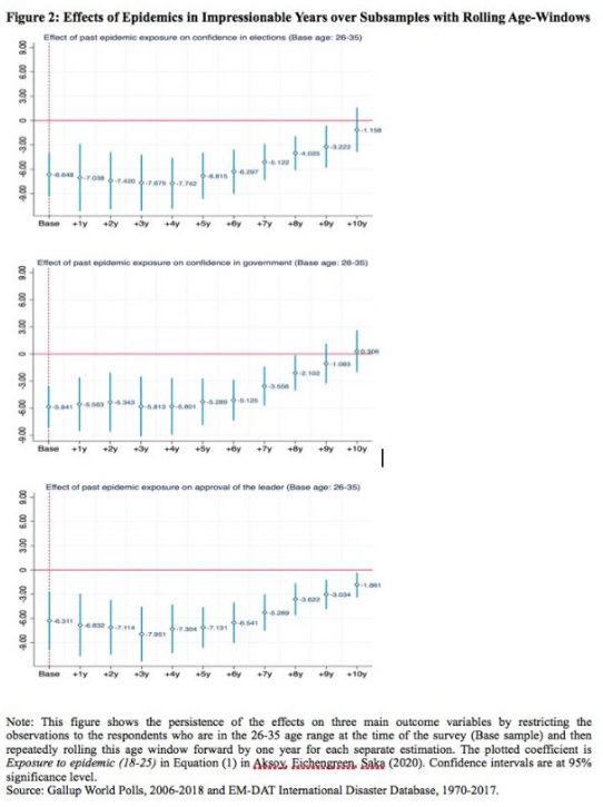 Specifically, we find that individuals who experience epidemics in their impressionable years (specifically ages 18 to 25) display less confidence in political leaders, governments, and elections.