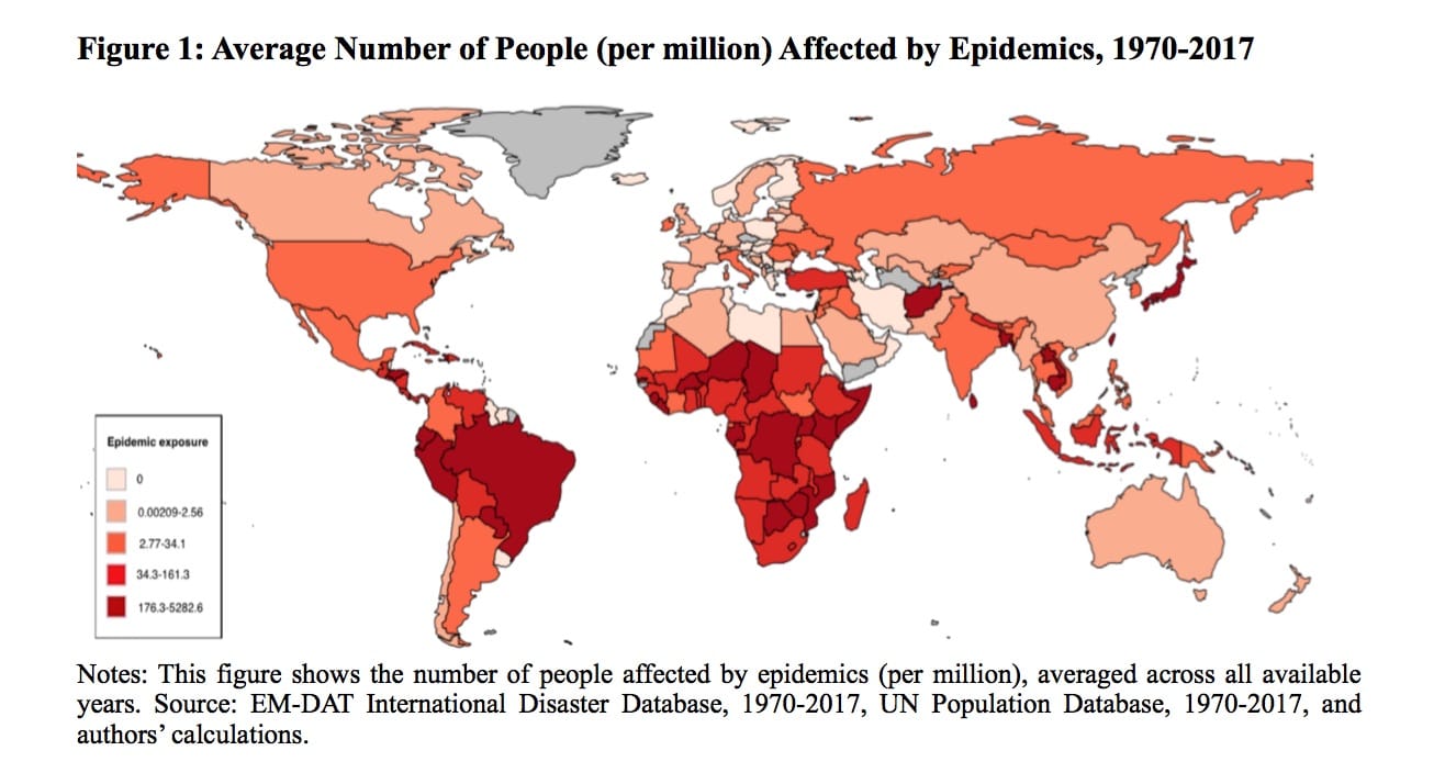 In a new paper, we provide the first evidence on the effects of epidemics on political trust. We use individual-level data on confidence in political institutions and leaders from the 2006-2018 Gallup World Polls (GWP), fielded in nearly 140 countries annually. Our data cover some 750,000 respondents from 142 countries. We analyse responses to questions about confidence in government, confidence in elections, and approval of national leaders. We link these individual responses to the incidence of epidemics since 1970 as tabulated in the EM-DAT International Disasters Database (see Figure 1).