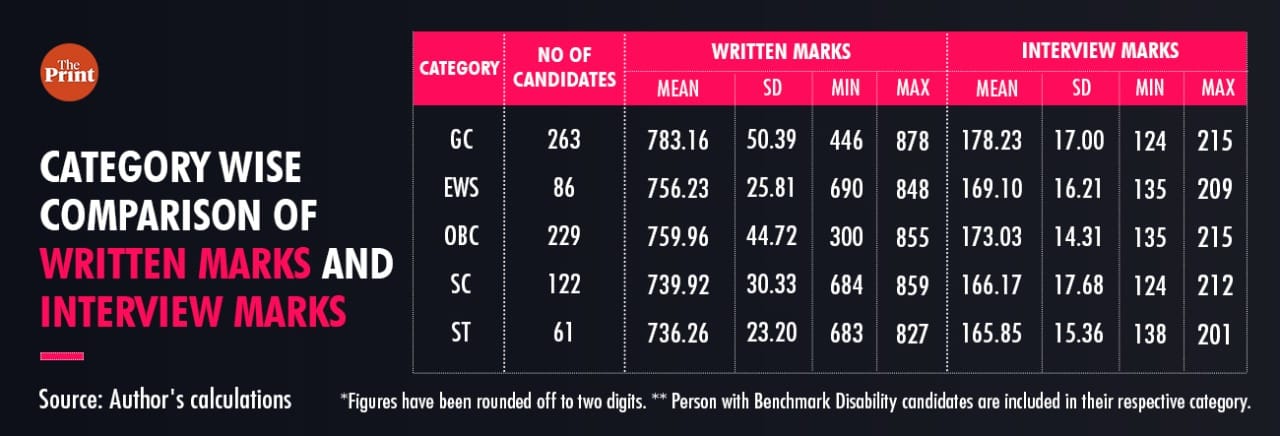 Table 1 gives an entry point to examine whether there exists any pattern in awarding of lower marks to the reserved category students despite their higher score in the written examination. And if such a phenomenon does exist, what could be the cause?
