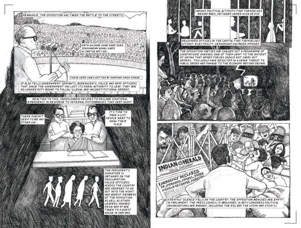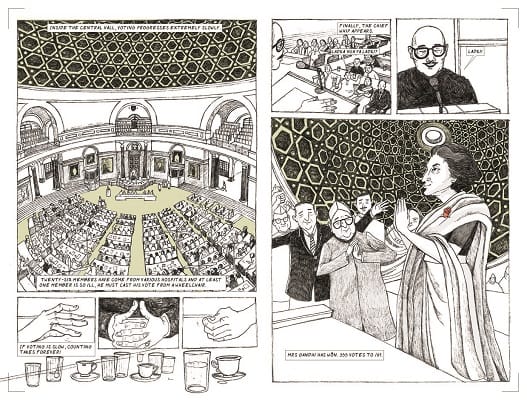 As the narrative took its final form, the prose chapters about Indira Thapa and Priyadarshini Chatterjee interleaved the graphic biography of Indira Gandhi.There were all these real and fictional people – Sardar Pal Singh, a cab driver who recounted the 1984 riots, Dhol Bahadur Thapa who remembered the war of 1962, and Gurmeet, Mala, Nafisa and Ravi, who articulated the Emergency – framing Mrs Gandhi’s story (which, too, is not only her story but also that of Jawaharlal and Kamala, Feroze and Sanjay and Rajiv, P.N. Haksar, R.N. Kao, Jayaprakash Narayan, Atal Bihari Vajpayee, and P and R, the grand-children).