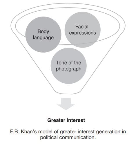 The second major theme that emerged from the data was that of a ‘greater interest’. Most of the photographs featuring BJP or its leaders were interesting. What made the pictures interesting was strong body language, varied facial expressions and the right variety in tone of the photographs. Strong body language and facial expressions in photographs have been proven to make the pictures more interesting and attractive. The following figure depicts the model of greater interest applicable to the BJP-related pictures appearing in the newspapers during the election campaign of 2014. The ‘funnel model’ depicts the three characteristics combining to generate greater interest.