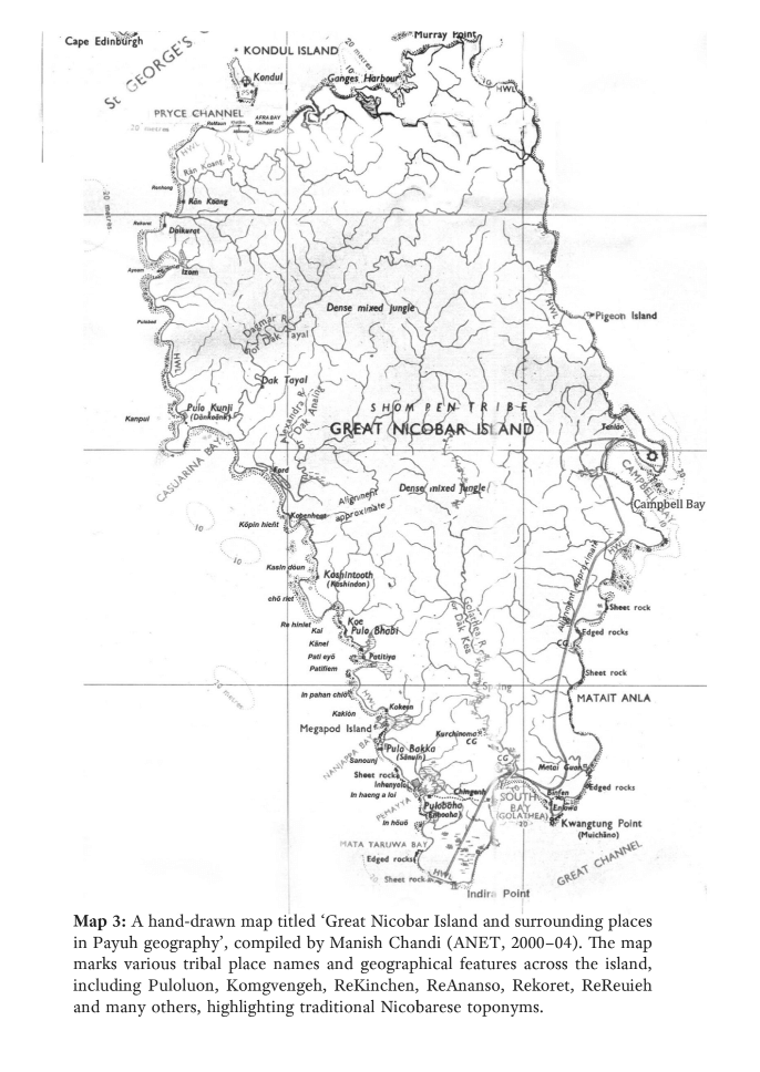 After 2004, he added more Nicobarese settlements and Shompen community areas to this map. However, given that these are efforts undertaken by one individual, the map is not exhaustive. It is safe to assume that there are many more unmapped tribal settlements and foraging grounds, more so those belonging to the Shompen community.