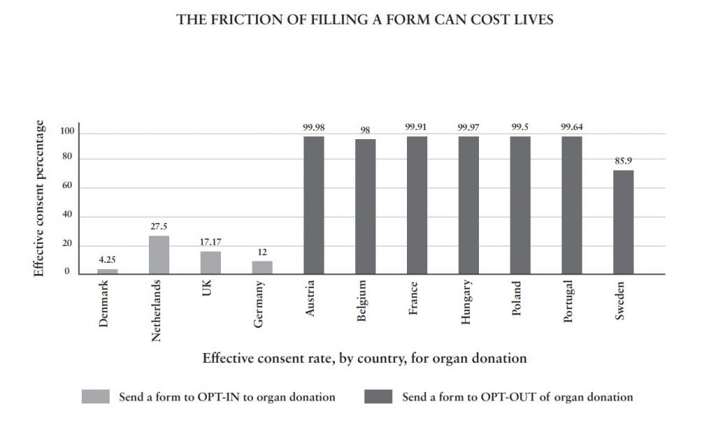 Out of the eleven countries shown on this graph, all of those with high donation rates had one simple design decision. They had made organ donation the default and asked people to send a form to opt out. The countries with low organ donation rates asked people to opt in for it. Asking people to send in a form was friction enough to stop people from donating. Just making a simple change to the process could change donation rates. Or as Johnson and Goldstein put it, changing the default can save lives.