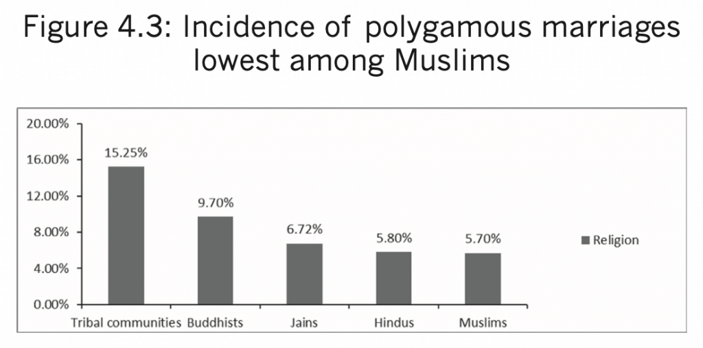The only study on the subject of polygamy ever done was by the Committee on the Status of Women in India, 1974, which showed that polygamy as a practice was not just exclusive to Muslims but was prevalent among all communities of India. In fact, it was found that Muslims were the least polygamous among all the groups (Figure 4.3).