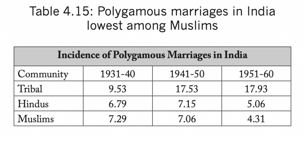Polygamy is the practice of having more than one spouse at the same time. This practice is outlawed in India, except for Muslims and some tribal communities, as their customary laws permit it. At the very top of the misinformation campaign is the propaganda that Muslims have multiple wives to have more children. Muslims in the country are subject to the terms of the Muslim Personal Law (Shariat) Application Act of 1937 which is interpreted by the All India Muslim Personal Law Board. But in a judgement of February 2015, the Supreme Court of India stated that ‘Polygamy was not an integral or fundamental part of the Muslim religion and monogamy was a reform within the power of the state under article 25.’ This meant that although their personal law permits Muslim men to have as many as four wives, the Supreme Court has ruled that a Muslim’s fundamental right to profess Islam does not include the practice of polygamy.