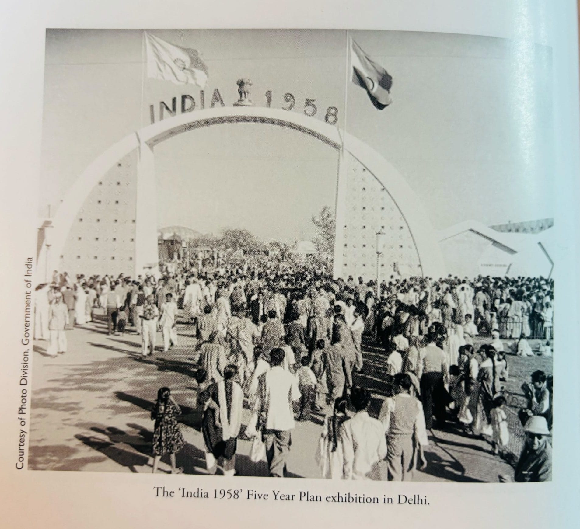 In the 1950s, the narrative was all about uniting to build a modern nation. There was a strong emphasis on technology, science, statistics, and large industries—all seen as pathways to the future. Stamps were issued, articles written, and cartoons drawn. The government even organised The ‘India 1958’ Five-Year Plan exhibition, which ran for two months in Delhi. Crowds flocked to Pragati Maidan, where the exhibition had four entrances: Gateway of Progress, Gateway of Commerce, Gateway of Science, and Gateway of Industry. Roads named “Yojana Path” (Plan Avenue) led to the Vikas Vatika (Garden of Development). The overarching message: India was an “ancient nation in the throes of regeneration,” as Menon describes in his book.