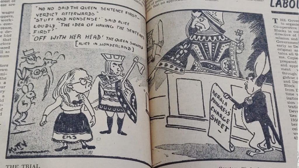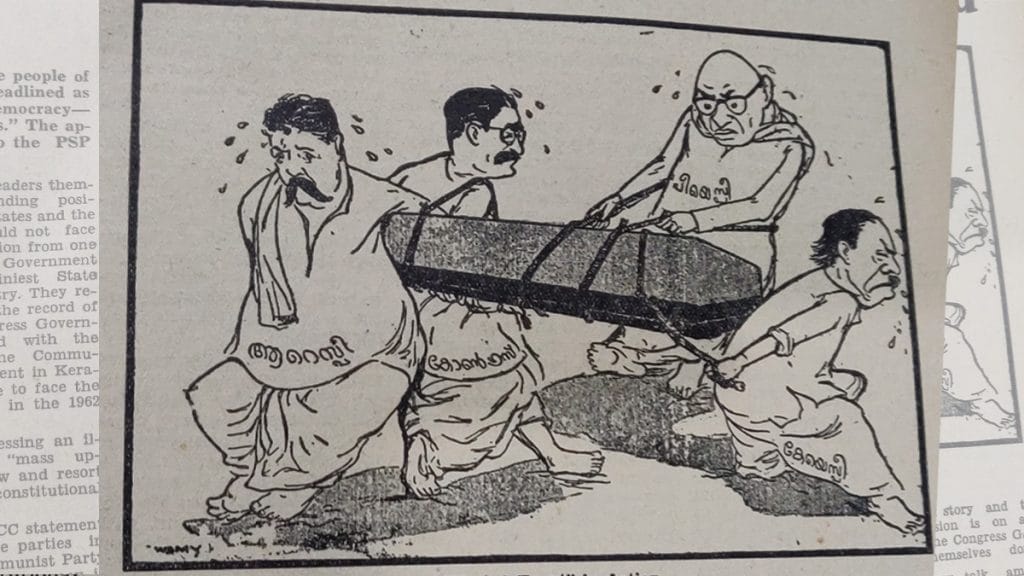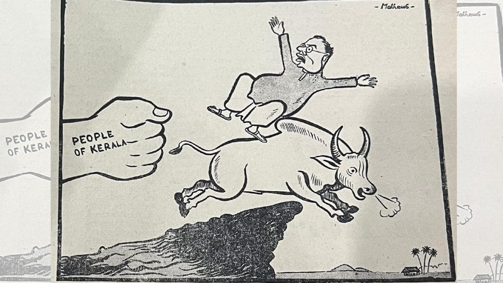 In 1957, when the CPI bagged a majority in Kerala, New Age was doing to Congress what Nehru would to Namboodiripad five years later — splatter mud on the party’s internal squabbles. In the cartoon below, the first Communist government took pride in ‘kicking out’ Panampilli Govinda Menon, former Congress CM of Travancore, who couldn’t divide the spoils among party members, eventually leading to a ‘cracked-up’ Congress and the President’s rule being imposed.