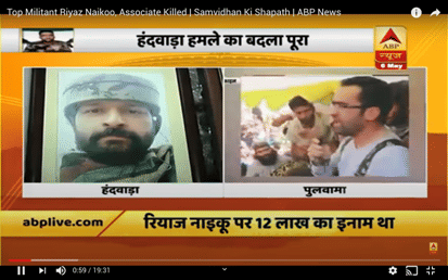 Zee News anchor Aman Chopra called Naikoo “aatank ke duniya ka sabse bada chehra” (terrorism’s biggest face), while ABP News’ Romana Isar Khan called him “aatank ka poster boy” (poster boy of terrorism).