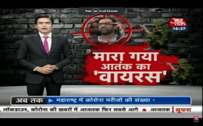 Aaj Tak’s Saeed Ansar claimed that Naikoo’s killing meant “aatank ka virus ka kaam tamaam” (the virus of terrorism has been defeated).