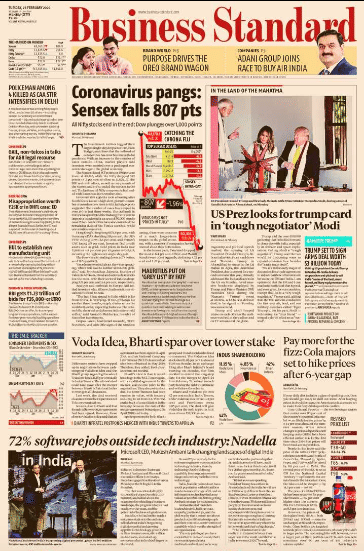 Today’s Business Standard is both the odd one out and a spoiler. It leads with the drop in benchmark indices because of the coronavirus outbreak. “With an increase in the number of cases outside China, market players said investors were worried over prolonged economic damage to the global economy,” the report notes.