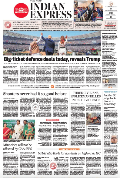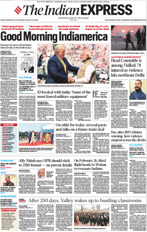 The communal clashes in Delhi is the other big story: there are grim details of what occurred, “Several parts of northeast Delhi turned into a battlezone and violence spiralled over the new citizenship law” as “rival mobs, armed with sticks, rods and petrol bombs, torched vehicles, shops and homes”. Another page 1 story, “Day after BJP’s Mishra warning…” links the violence and BJP leader Kapil Mishra’s provocations a day earlier — “The area had been on edge since Sunday when a rally by BJP’s Kapil Mishra to counter anti-CAA protests in the area had been followed by waves of stone-pelting”.