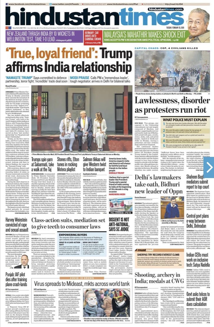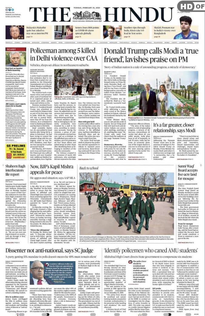 US President Donald Trump and Prime Minister Narendra Modi obviously take the cream of the headlines, with photographs of them hugging on nearly all front pages. Unfortunately, the coverage was marred by reports on Delhi burning as pro- and anti-CAA protestors clashed, resulting in the death of six people.