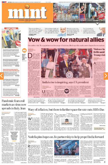 Mint says it with headlines: “Vow & Wow for natural allies” states that even though there’s no trade deal on the agenda for Donald Trump’s visit, “India’s trade deal with the US is just a matter of time”. The piece notes that the “changing geopolitical landscape, coupled with closer ties with the US, makes a deal that benefits both nations inevitable”.