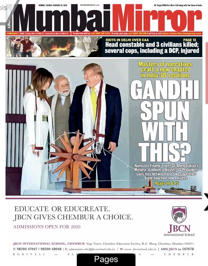 Mumbai Mirror has no story on its front page, but features an image of the US President, the First Lady and PM Modi at Sabarmati ashram. The paper calls the visit a “big hit”. A small banner on top gives space to the violence that engulfed Delhi claiming the lives of a “head constable and 3 civilians”.