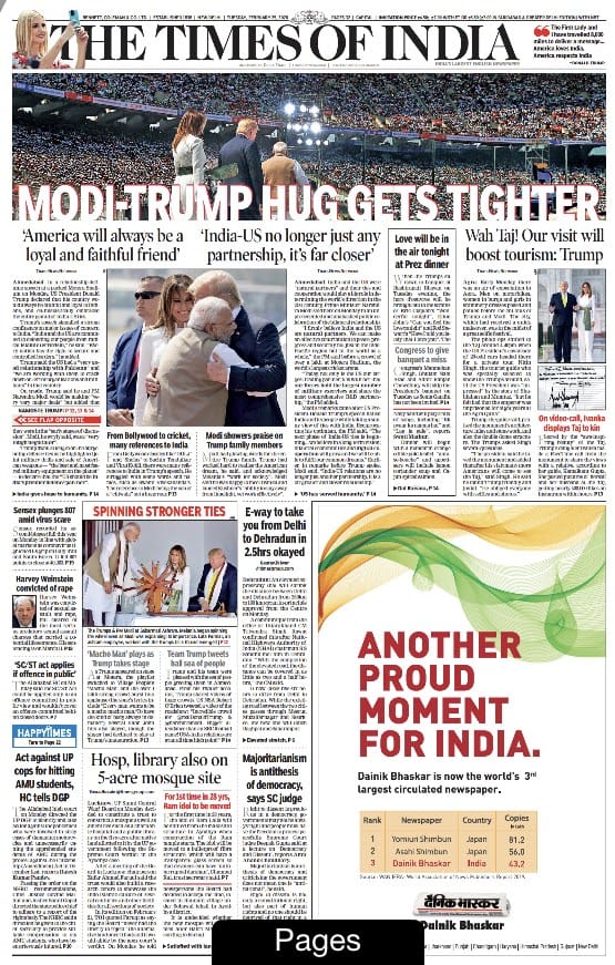 Otherwise, it is all love and hugs as TOI celebrates the Modi and Trump bromance. The lead notes, “In a relationship-defining speech at a packed Motera Stadium on Monday, US President Donald Trump declared that his country would always be faithful and loyal to Indians.”