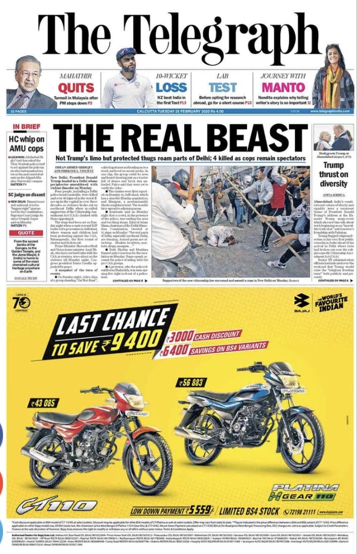 The Telegraph is back with its powerful headlines — “The Real Beast’’ takes a dig at POTUS’ car and points to the real beast — communal violence in Delhi. The lead reads: “President Donald Trump landed in a Delhi whose peripheries smouldered with violent disorder on Monday.”