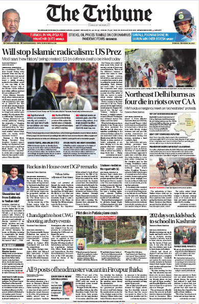 The Times of India devotes most of page 1 to the Trump visit and sidelines Delhi’s violence to the flap: “A wide swathe of Northeast Delhi — Jafrabad to Chand Bagh and Karawal Nagar — was wracked by communal riots and incidents of rampant vandalism on Monday as anti- and pro-CAA groups clashed for over seven hours”, it writes.
