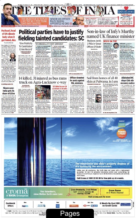 Also, as the SC “passed a slew of directions to curb ‘alarming’ rise in criminalisation of politics and made it mandatory for political parties to justify fielding tainted persons in polls”, TOI revealed that upto one-third of lawmakers face “criminal cases”.