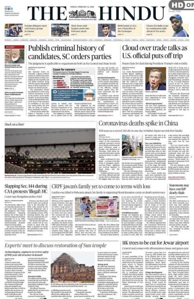 The Supreme Court asking political parties to disclose the details of their candidates’ criminal cases also got plenty of headlines as did the spike in coronavirus cases in China.