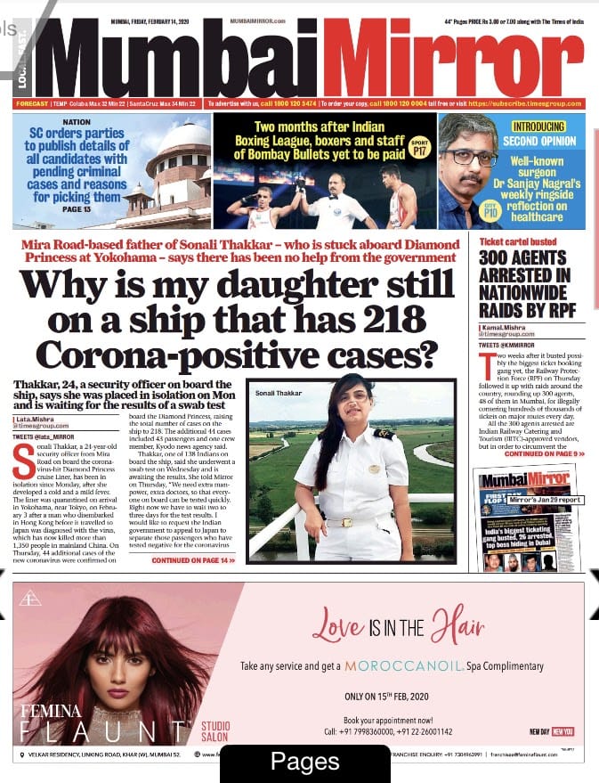 In its lead Mumbai Mirror writes, “Mira Road-based father of Sonali Thakkar – who is stuck aboard Diamond Princess at Yokohama – says there has been no help from the government.” Another report covers the arrest of 300 agents “48 of them in Mumbai, for illegally cornering hundreds of thousands of tickets on major routes every day.”