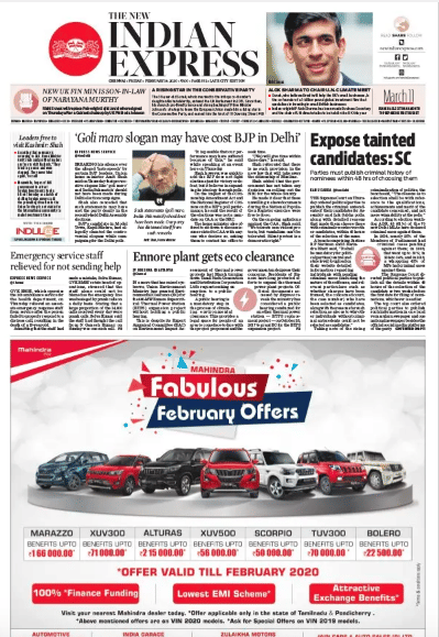 Amit Shah’s regret and the apex court’s orders on criminal cases also rule The New Indian Express’s front page. A half-page advertisement limits the number of reports. The other interesting, albeit shocking, story is about the Environment Ministry giving a green signal to the Ennore thermal plant despite the Expert Appraisal Committee “turning down Tamil Nadu Generation and Distribution Corporation Ltd’s request seeking an exemption to a public hearing” (necessary to obtain a clearance).