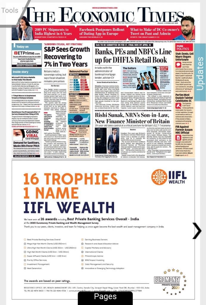 Economic Times offers some hope on the economy: rating agency S&P predicts that India’s economic growth will recover and hit 7.4 per cent in 2022. Also, 14 companies including foreign banks, private equity funds and other local non-bank lenders, are now “lining up” to buy bankrupt mortgage lender Dewan Housing Finance’s “entire retail portfolio worth Rs 32000 crore”. There’s also a small item about Microsoft CEO Satya Nadella’s visit to India this month, which might or might not coincide with US President Donald Trump’s visit.