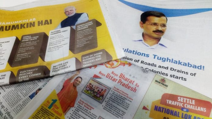 This is a pattern, seen over the last few weeks. The Indian Journalism Review counts “74 full page advertisements in 3 English newspapers” — Express, TOI, HT — “in just the first six days of March”.