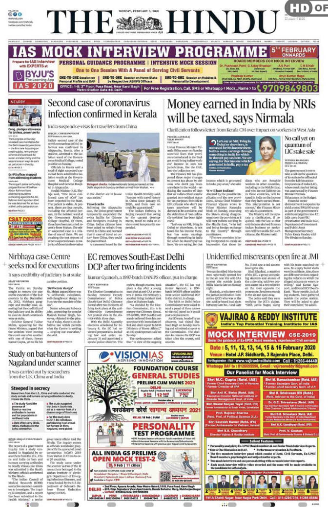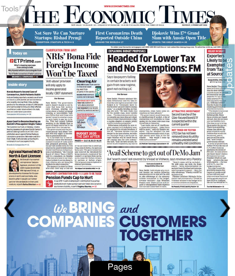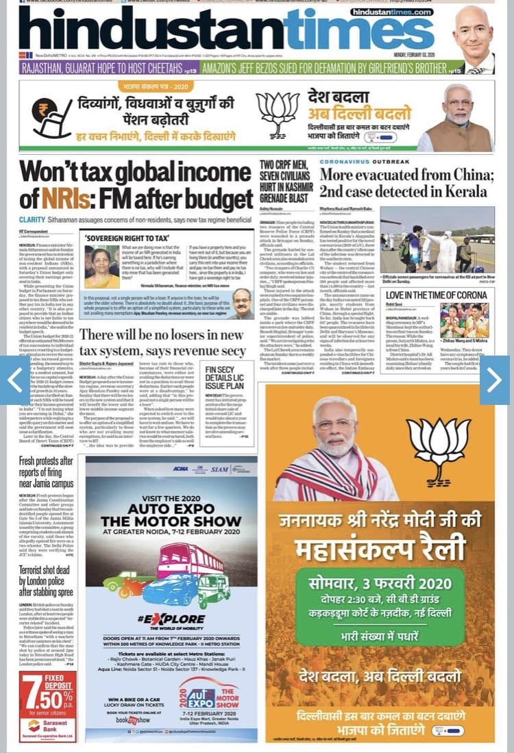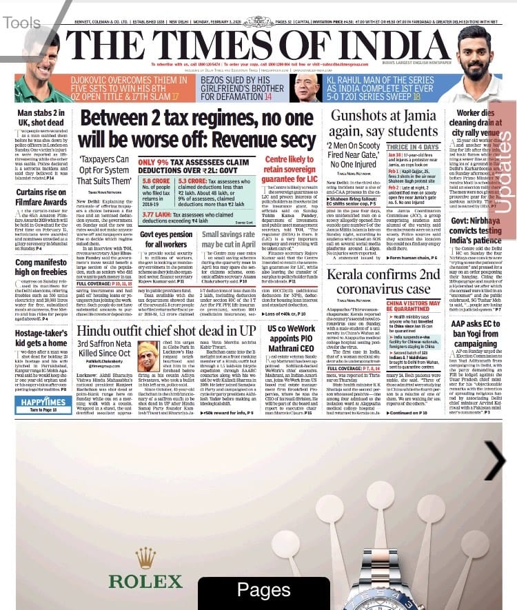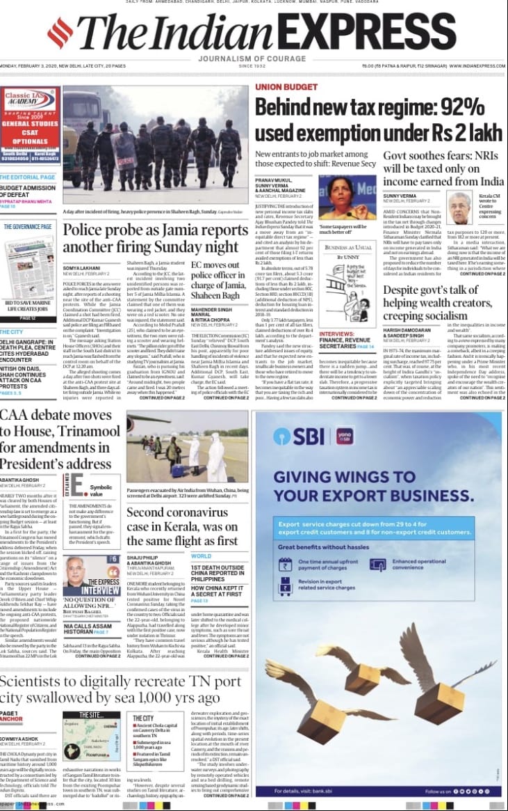 The Times of India reports on the gunshots at Jamia and the second confirmed case of coronavirus in Kerala. Uncharacteristically, it does not have a flap this Monday morning but makes up for it with a half page advertisement. It’s lead is based on an interview with the revenue secretary Ajay Bhushan Pandey on page 11 where he explains the attempt to move to a “simplified tax regime’’.
