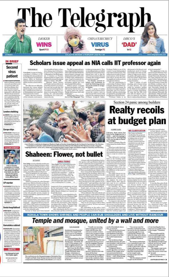 Doesn’t this look like a normal front page? Unusual by The Telegraph’s wacky standards but the headlines here are still strong. Its lead story (“Scholars issue appeal as NIA calls IIT professor again”) is on one Arupjyoti Saikia, a professor of history at IIT Guwahati “who was questioned by the National Investigation Agency (NIA) on Saturday, has been asked to present himself for another round on Monday.” It also carries a feel good communal harmony anchor piece on temples and mosques