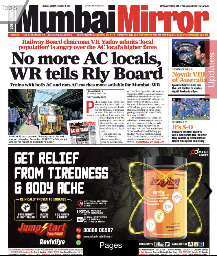 Mumbai Mirror leads with a report on Mumbai’s AC locals, “Railway Board chairman VK Yadav admits ‘local population’ is angry over the AC local’s higher fares”. The half-page advertisement leaves little space for more, and what little there is goes to sports news — the five set win of Novak Djokovic in the Australian Open and India’s 5-0 clean sweep of New Zealand in T-20.