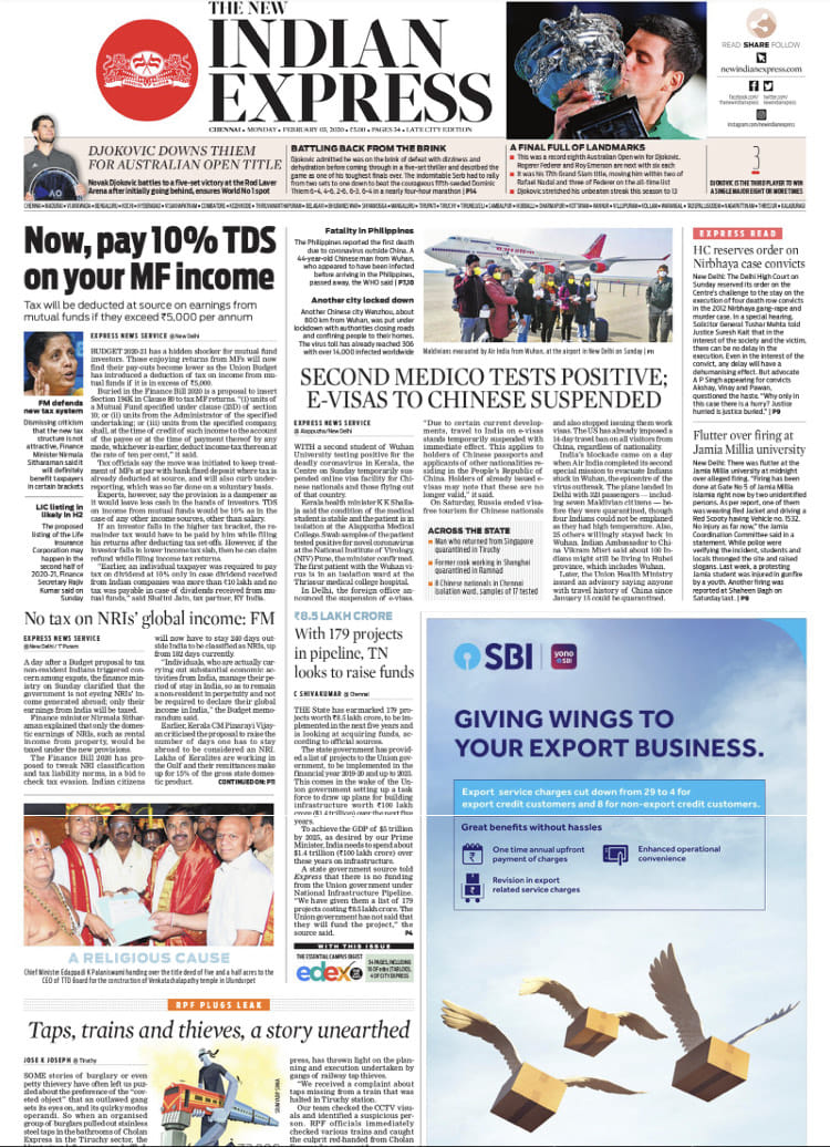 The New Indian Express has just bad news: the detection of a second coronavirus case in Kerala — “The centre on Sunday temporarily suspended online visa facility for China nationals” — and how we have to pay 10 per cent TDS on our mutual fund investments. The paper also covers Tamil Nadu’s 179 projects in the pipeline worth 8.5 lakh crores, which the state is looking to raise funds for.