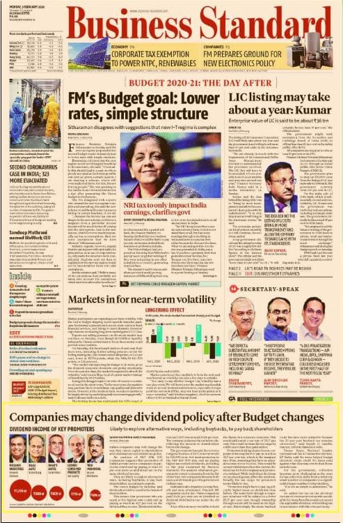 Business Standard’s most interesting Page 1 story is its anchor on “Companies may change dividend policies after Budget changed,” which says that industry is “likely to explore alternative ways, including buybacks, to pay back shareholders” after the Union Budget said dividends would be taxed “in the hands of shareholders,” which will lead to upto 20 per cent more additional tax. There’s also a warning about markets in for near-term volatility — “too early to say whether Budget Day volatility was a one day event,’’ said Krishna Sanghavi, Mahindra Mutual Fund.