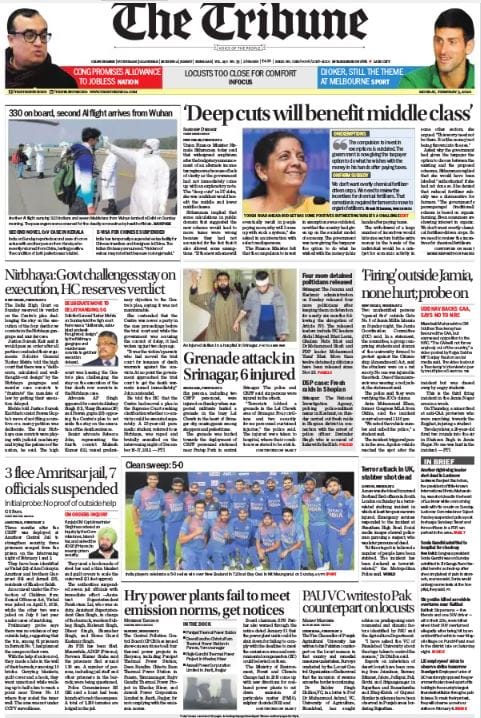 The Tribune celebrates Indian cricket team’s clean sweep against New Zealand and carries a small item on Punjab Agriculture University’s VC “writes to Pak counterpart on locusts”. The paper’s “3 flee Amritsar jail, 7 officials suspended”, says “Punjab CM Amarinder Gill has ordered an inquiry by the Commissioner, Jalandhar, and asked the ADGP to revamp prison security.”