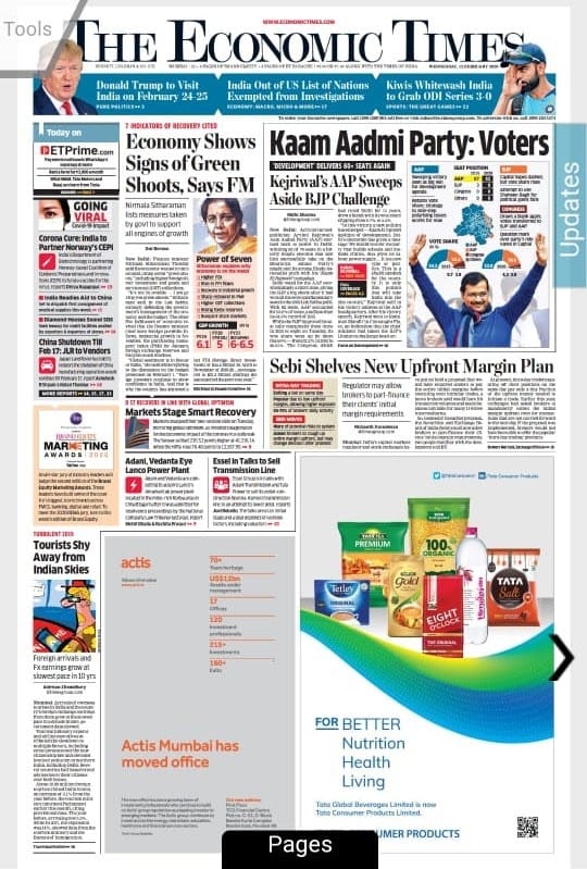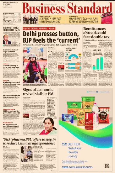 Mint goes “tech-friendly” for its Delhi polls’ headline: ‘DELHI DOWNL ADS AAP 3.0’. On Arvind Kejriwal’s third-time win the paper notes: “Its first win could be written off as a fluke, the second perhaps a mere coincidence but a third win on the trot is every bit a pattern”. The FM’s list of the seven signs is here too. Read the report about how the US has raised hopes for a “breakthrough in trade” ahead of Trump’s visit. Mint also notes the CBI’s “clean chit to its former special director Rakesh Asthana” in a small item on page 1.