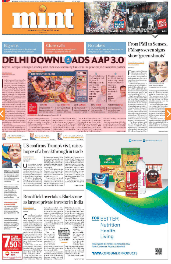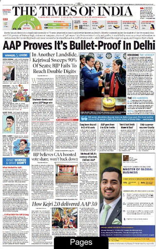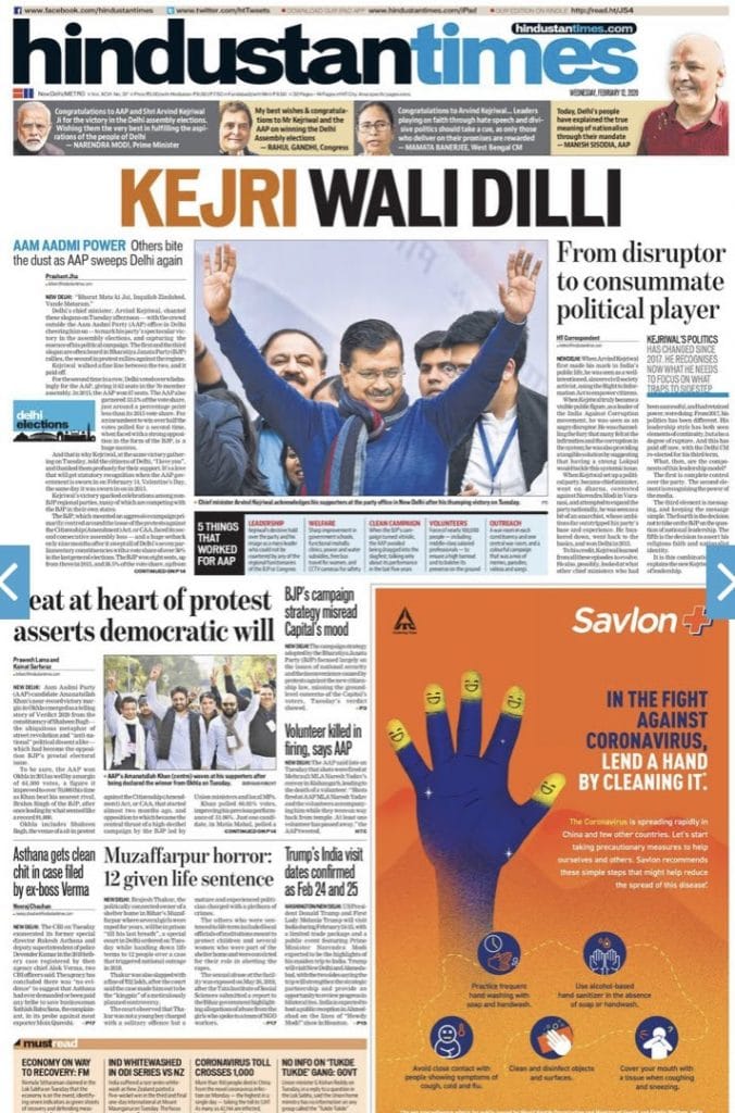No guesses about today’s lead story: Aam Aadmi Party’s ‘sweeping’ victory in Delhi’s assembly elections Tuesday. Party chief Arvind Kejriwal’s photograph was plastered across front pages of leading papers — eclipsing even the redoubtable President of the United States, Donald Trump, whose visit to India later in February was announced. Note how the victory was celebrated with pun-filled headlines.