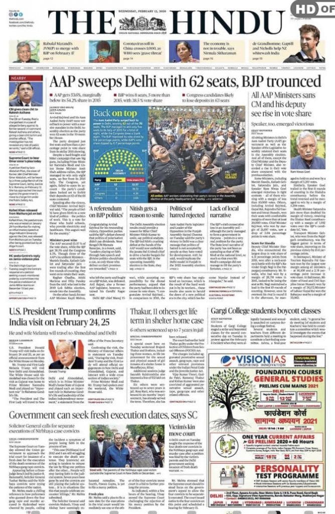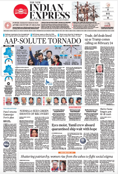 The Hindu is unwavering in its straightforward style of headline and reportage. Its lead merely reports the poll result — AAP won a “massive mandate”, the papers notes. Another related, yet interesting, report indicates that all sitting ministers of the party, “except the Chief Minister and the Deputy Chief Minister, also recorded a rise in their vote share compared with the previous election.” Trump’s visit on 24-25 February gets a look in. The report says that “Ahmedabad was chosen for the visit as Gujarat was home to Prime Minister Narendra Modi and played an ‘important role’ in Mahatma Gandhi’s life.”